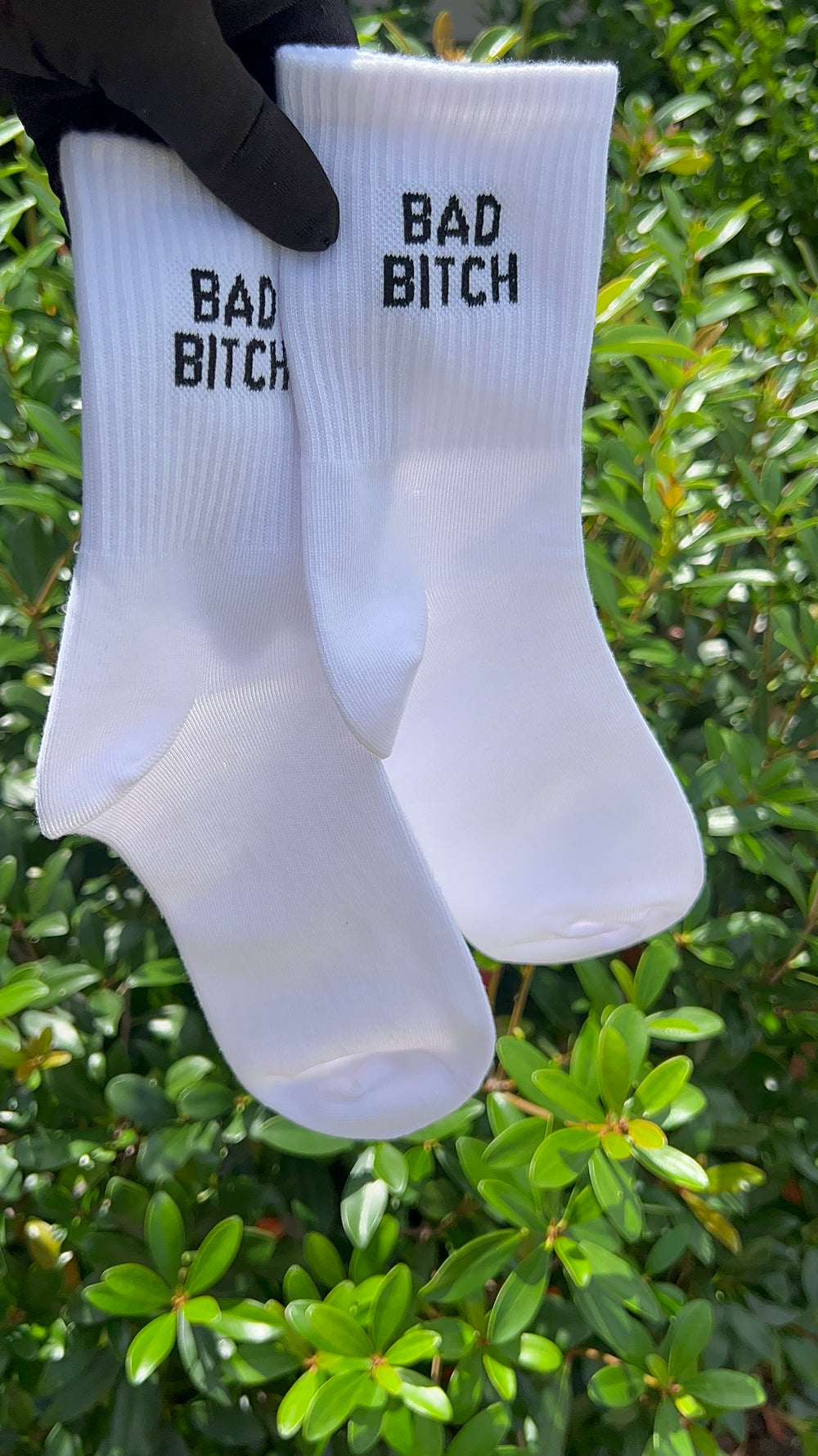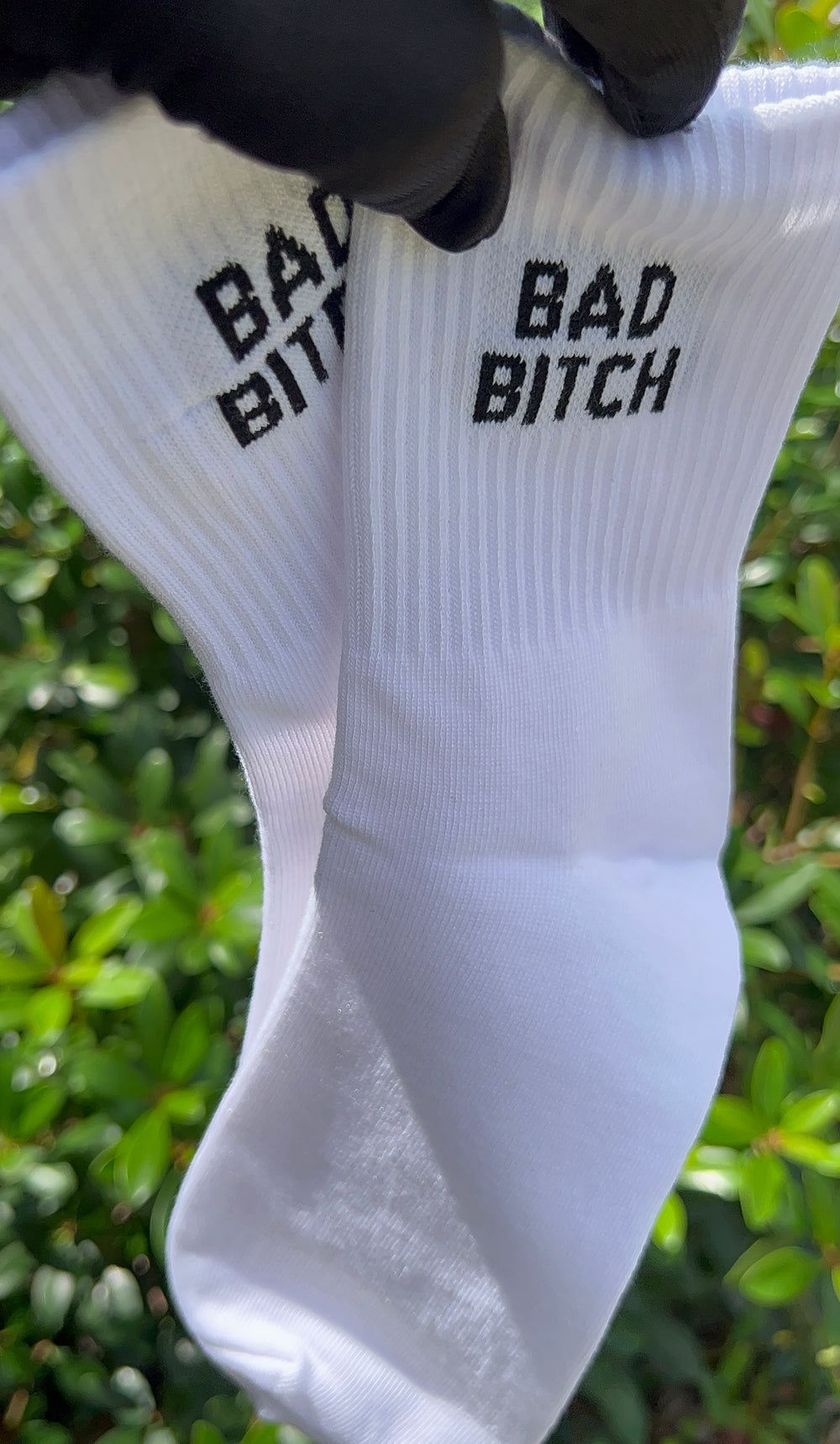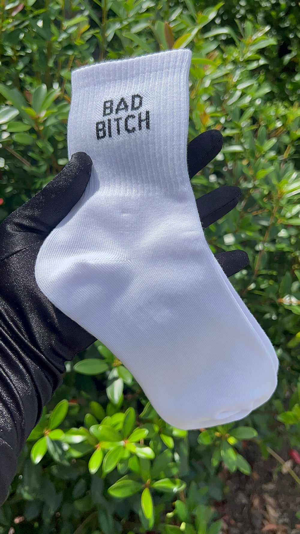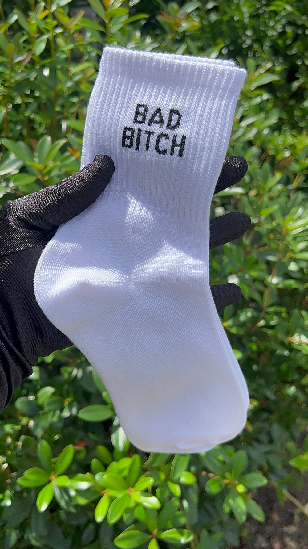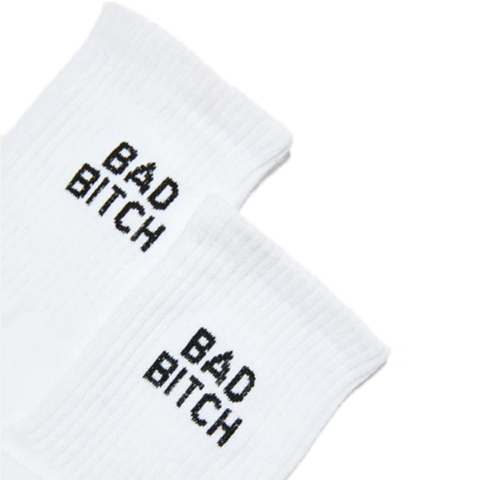 Express your sass with these Bad Bitch Crew Socks. Made with 90% cotton and 10% spandex, this one size pair of ankle socks features a ribbed detail and "Bad Bitch" verbiage for a comfortable yet stylish look. Available in both White/Black and Black/White.